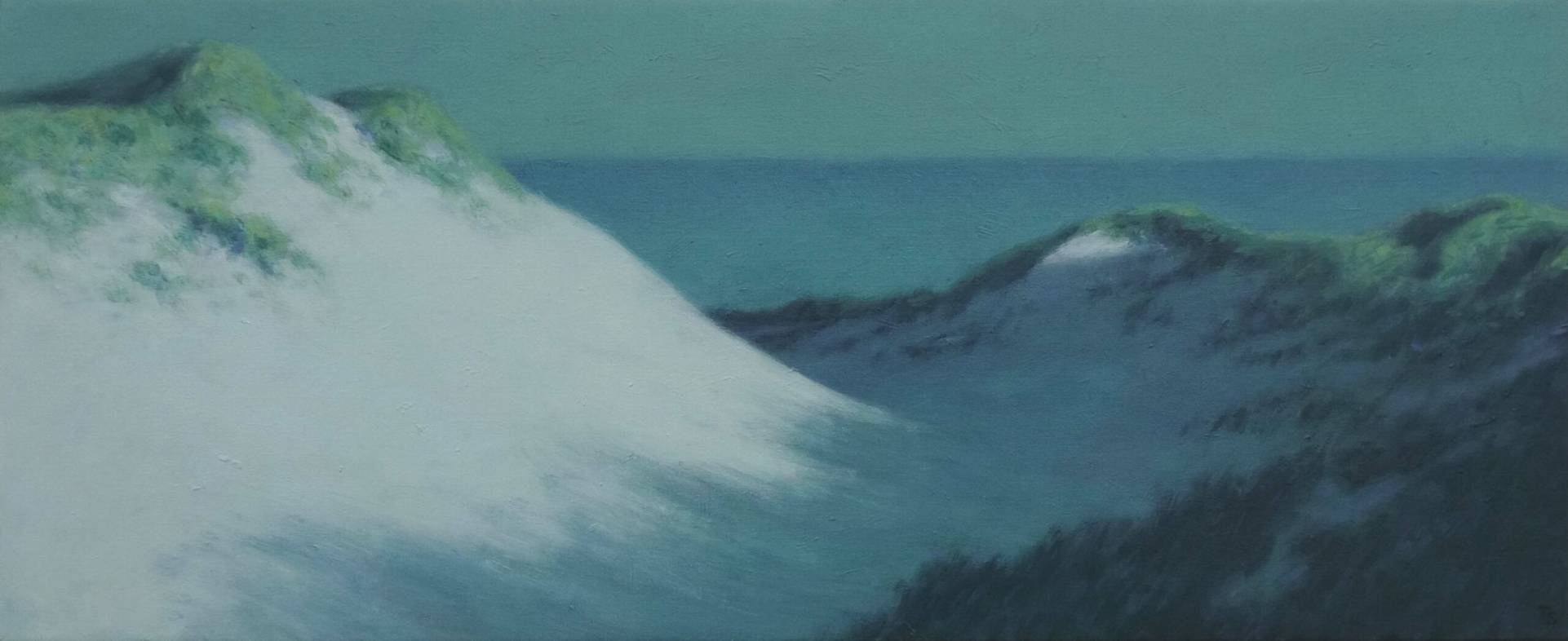 Een landschap verandert voortdurend van sfeer door het licht, het weer, de seizoenen, maar ook door de gemoedstoestand waarmee je ernaar kijkt. Ik merk dat ik tijdens het schilderen steeds vaker op zoek ga naar weidsheid, ruimtelijkheid, lucht, misschien als tegenhanger voor het complexe leven. De vergezichten, de mist in de bergen en de wolkenluchten voeren mij daar ver vandaan.”