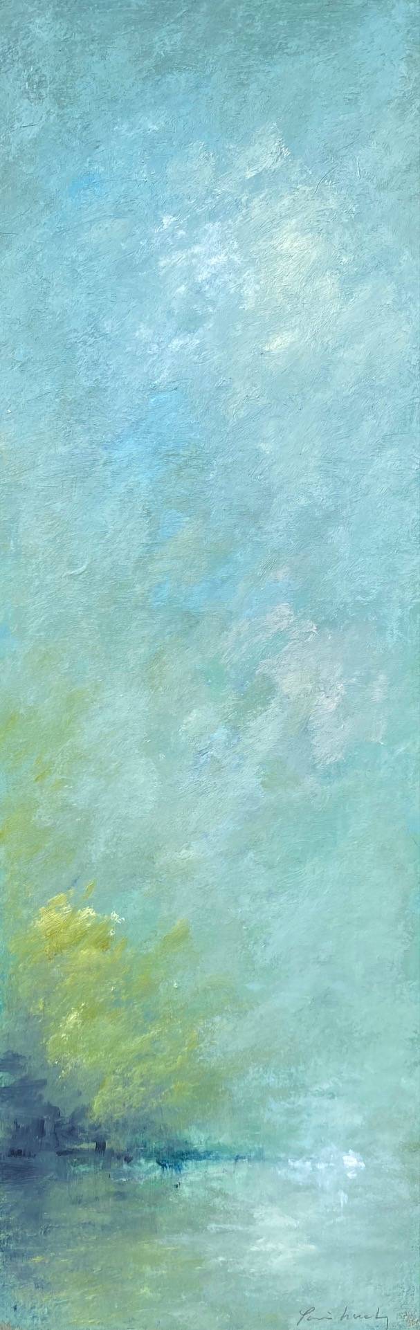 "J'aime la lumière, l'espace, les ciels torturés avec du mouvement, de la puissance dans les nuages, une percée de ciel bleu, un rayon de soleil..." Xavier crée une peinture jubilatoire qui navigue entre plénitude et harmonie pour nous offrir un voyage imaginaire tout en vibration lumineuse. Les paysages sont comme suspendus dans l'opacité de la brume, le calme, le silence... la solitude