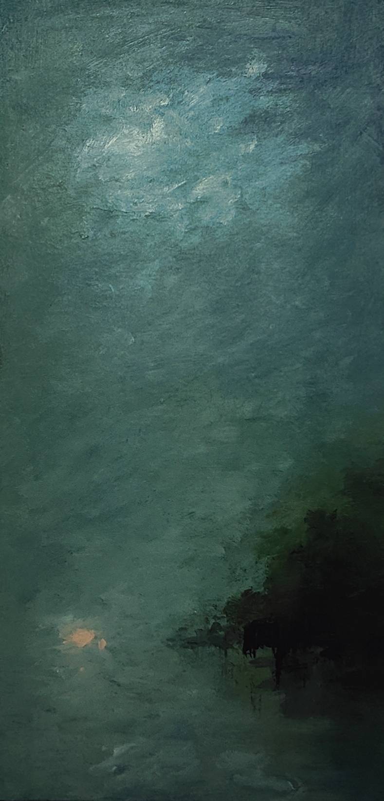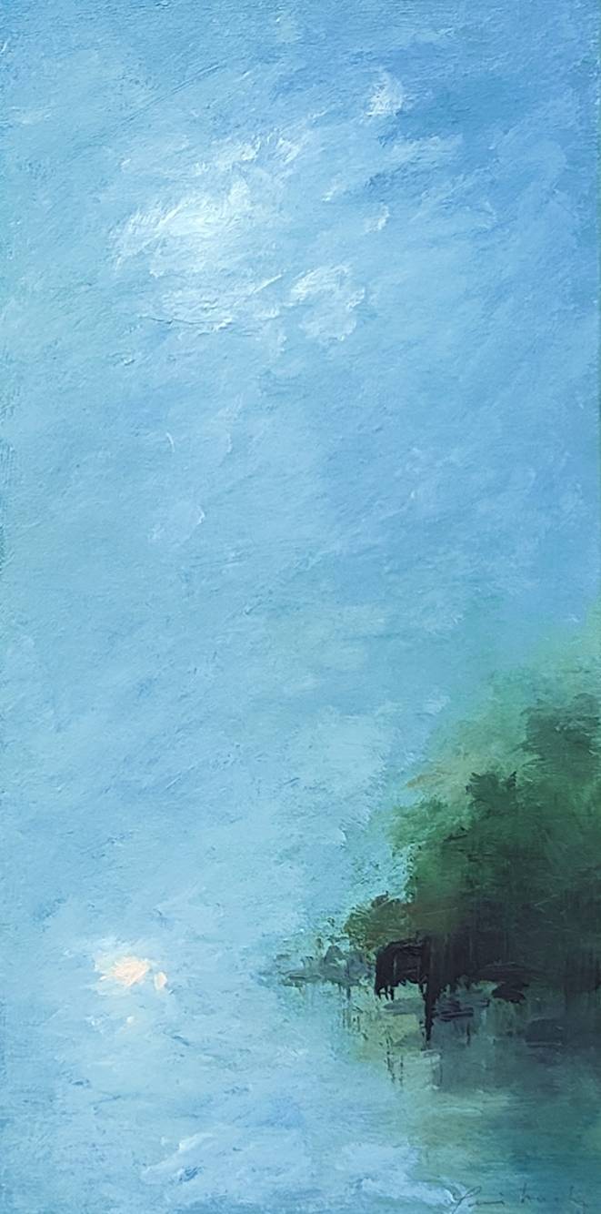 Ses huiles sur toile abordent au pays d’un imaginaire figuré, sans jamais qu’elles ne se perdent en route. A l’aise dans les petits comme dans les grands formats, il fait advenir dans ses tableaux ce qui ne peut, théoriquement, pas être représenté : l’odeur du petit matin, le bruissement de l’eau, le souffle du vent, la solitude du promeneur. Et ses paysages deviennent poétiques à force de n’être qu’esquisse !